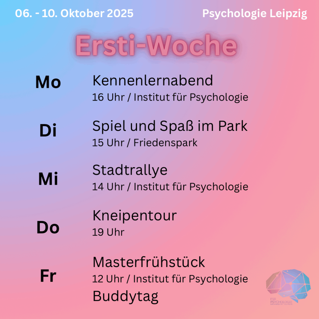 Wir vom Fachschaftsrat veranstalten vor Vorlesungsstart vom 06.10.2025 bis 10.10.2025 die Erstiwoche mit verschiedenen Veranstaltungen zum Kennenlernen. Infos dazu findet ihr hier und auch auf unserem Instagram-Kanal (@fsr_leipsych).